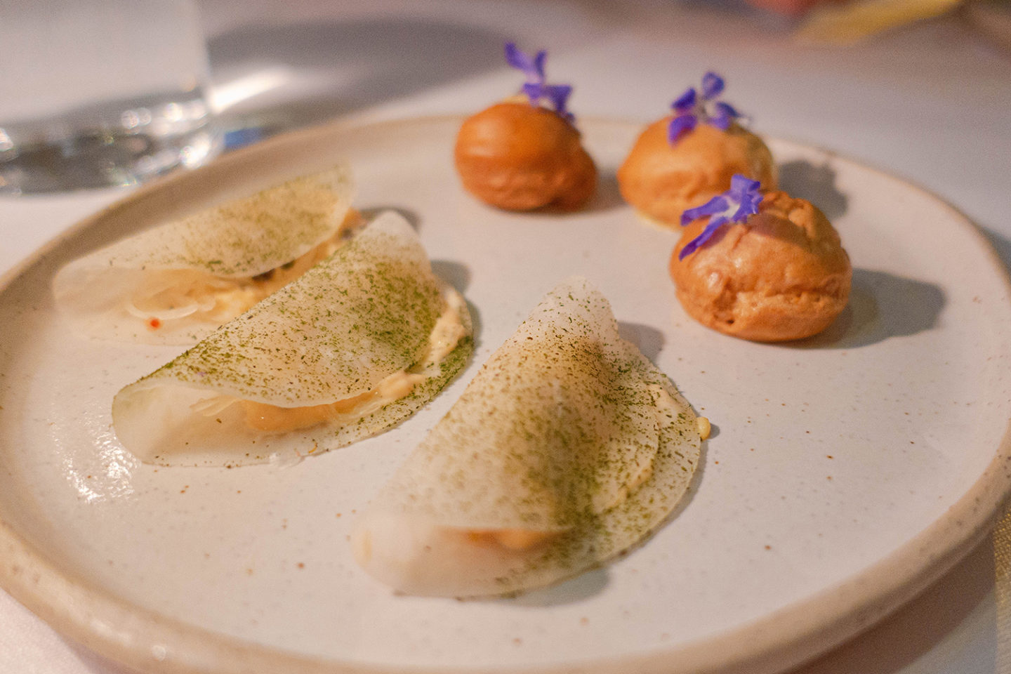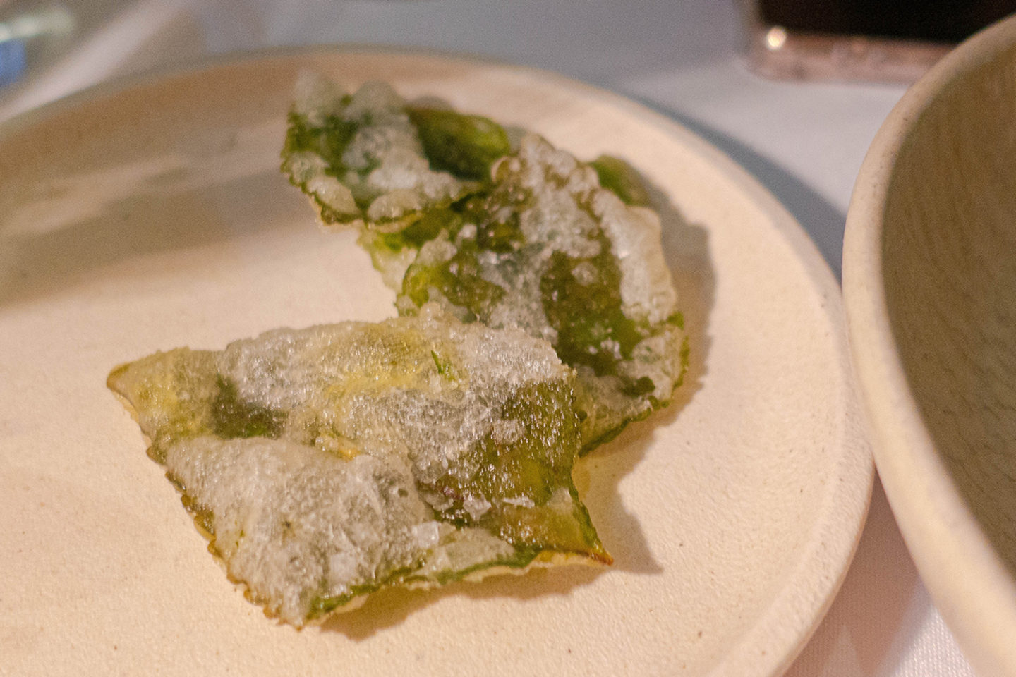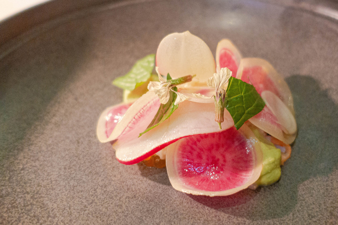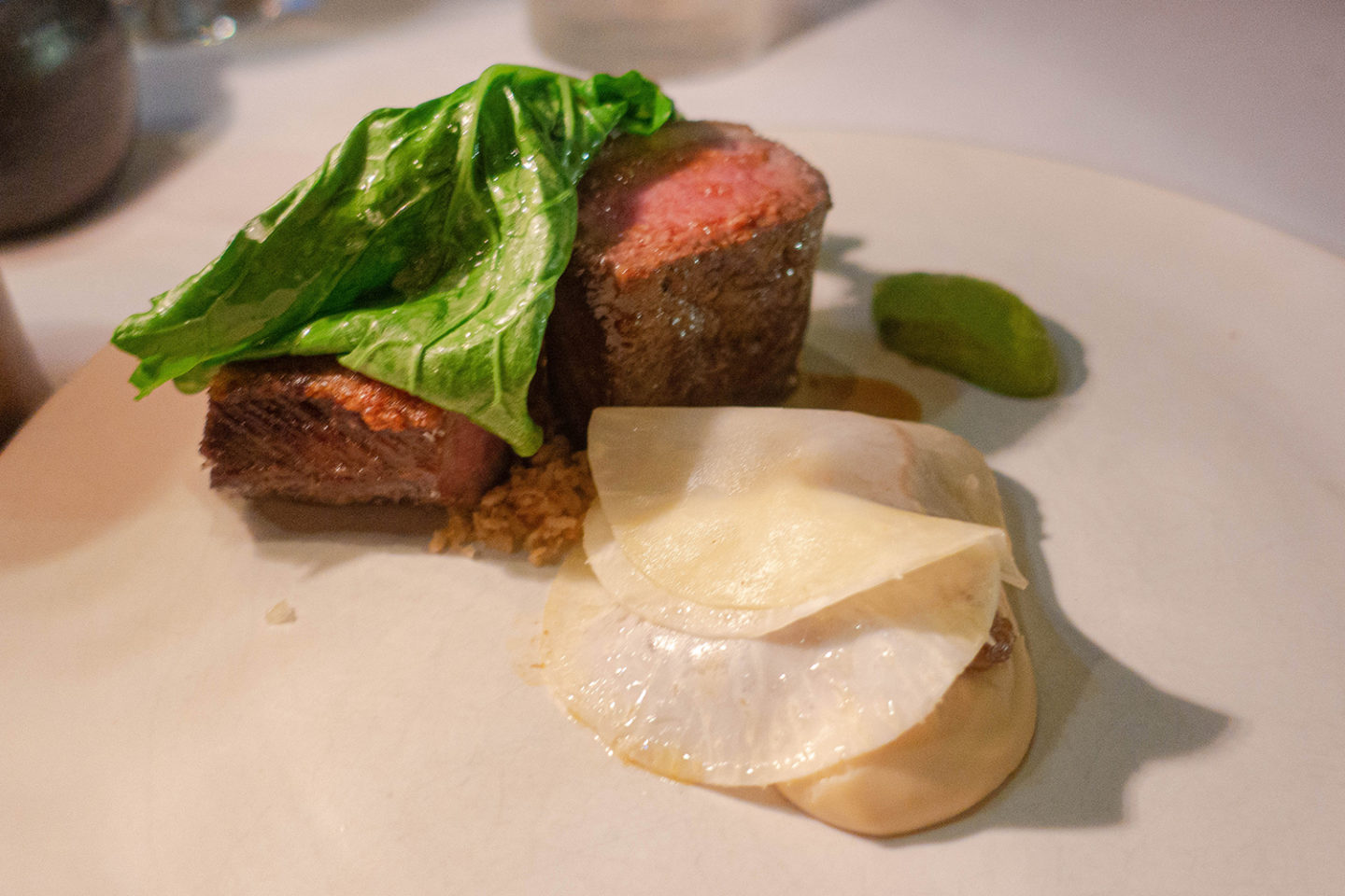 The other item was a folded radish over some American cheese (Curd? I missed what the server said). The radish was a delicate, cold blanket. It was a refreshing bite with a nice touch of tartness.