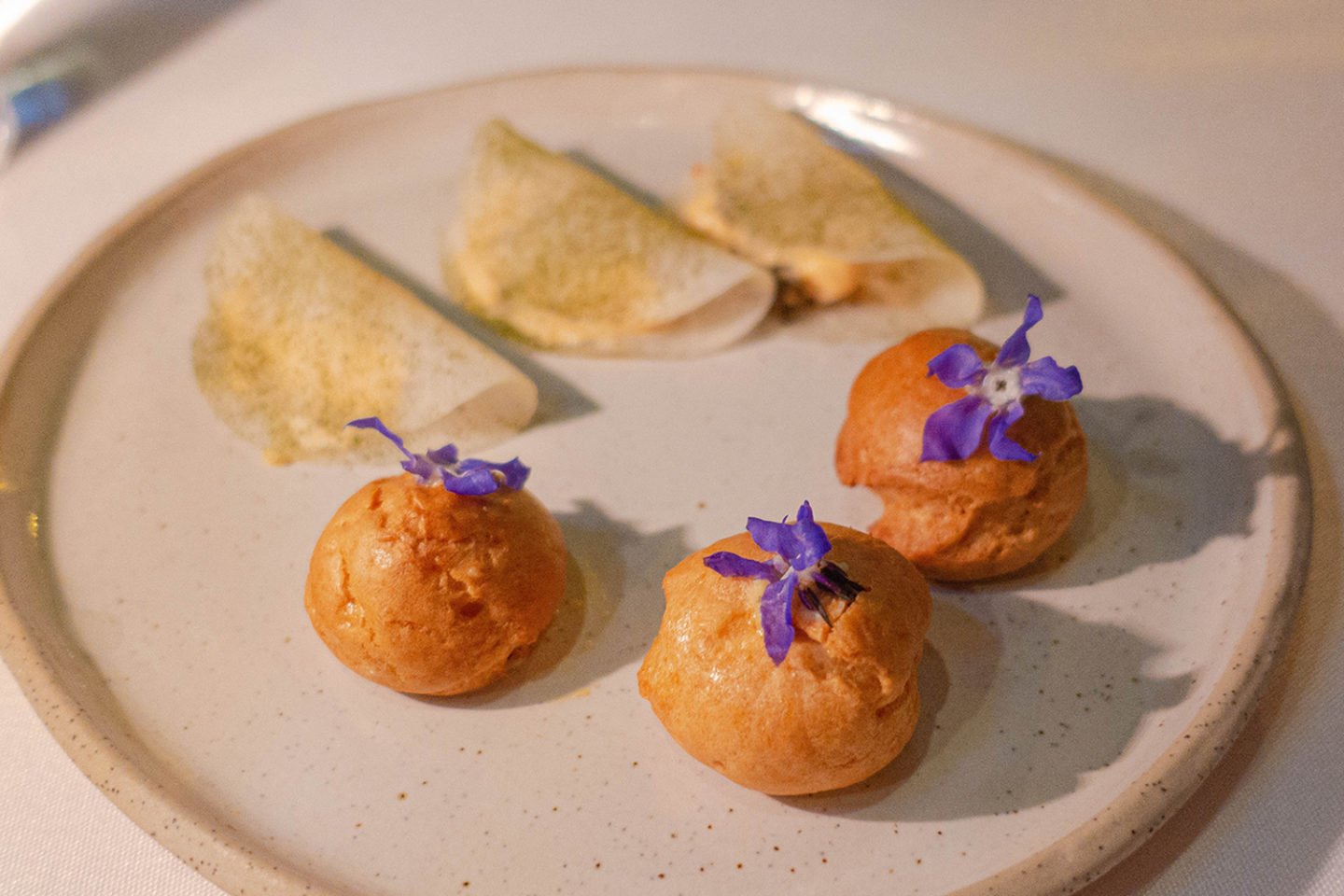 To start the courses, the coral trout crudo, fennel yuzu, wood sorrel was an interesting combination of salt, umami and citric. The trout was fresh and thinly sliced, wrapped delicately in a flower shape. Its mild fishy flavour was enhanced nicely by the oceanic salt of the dried fish crackers.