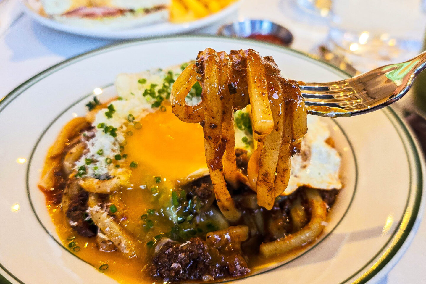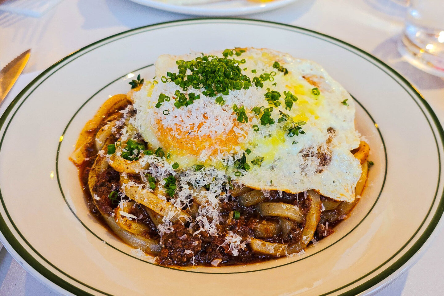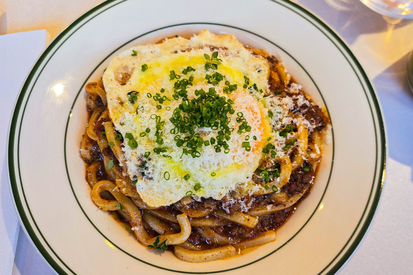 The bolognese udon $25 and fried egg extra $3 featured tender wagyu beef simmered in a rich, savoury sauce, coating thick, chewy udon noodles. It was topped with a dusting of parmesan cheese and a sprinkle of fresh chives. A perfectly fried egg added extra richness, its golden yolk blending beautifully into the dish. It was great, but as chefs, we knew how to replicate it at home so again, delicious but nothing spectacular.