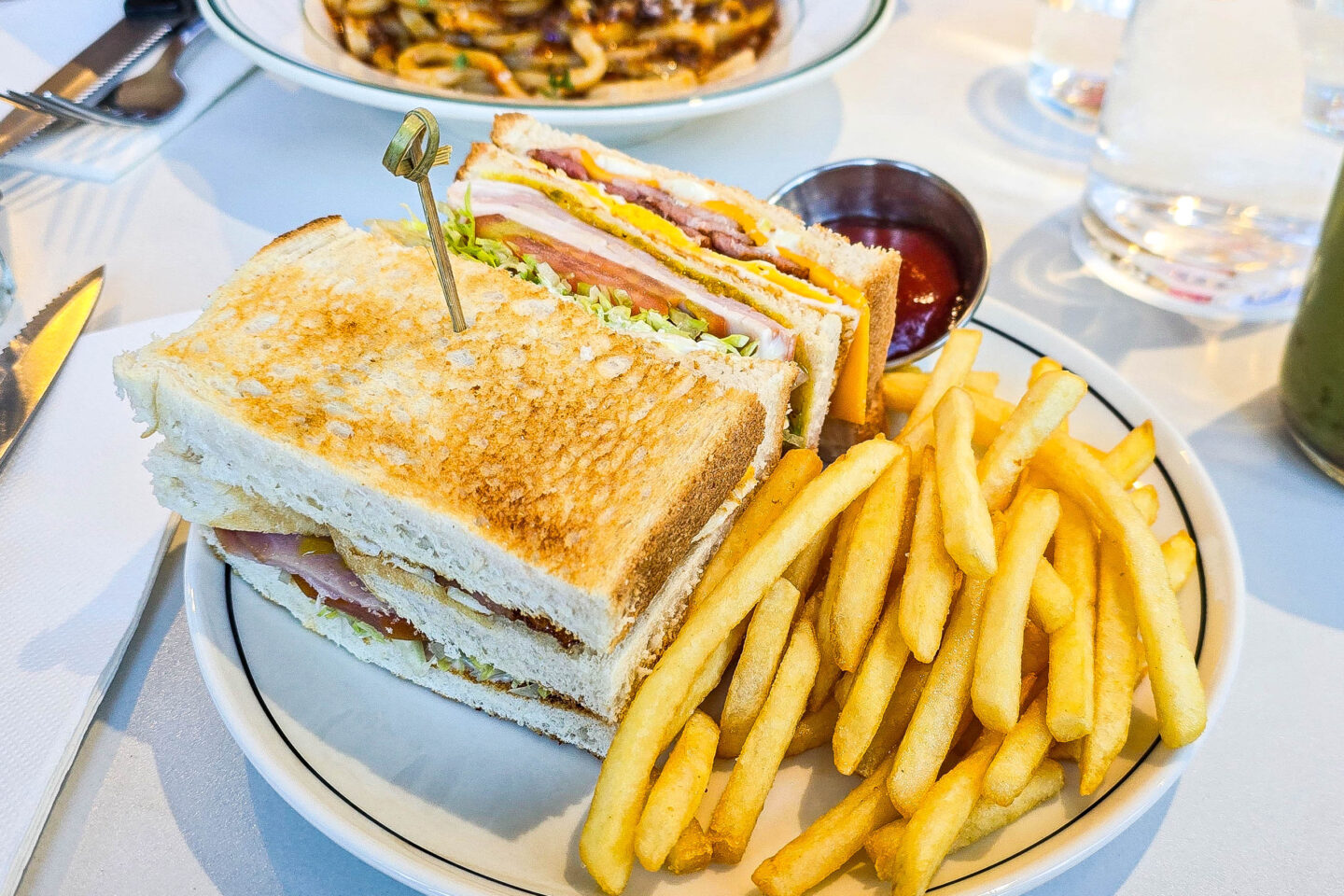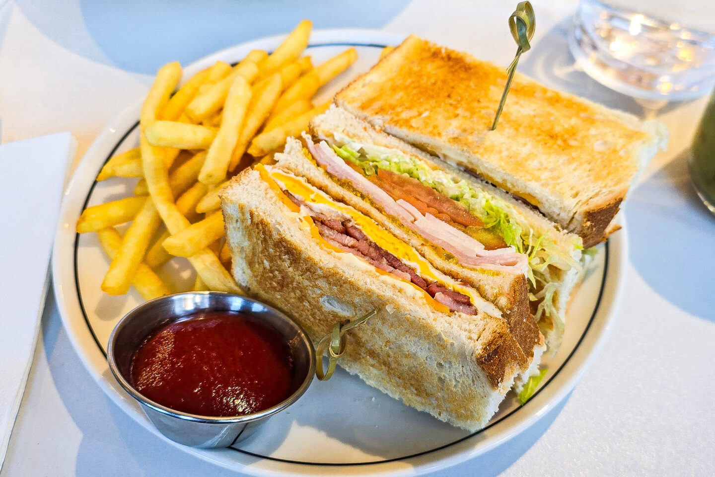The club sandwich with fries $23 arrived stacked high with layers of smoked chicken breast, Virginian ham, crispy bacon, egg, American cheese, and fresh iceberg lettuce, all tucked between slices of soft white bread. It was finished with sweet mustard pickles and creamy mayo, served alongside a generous portion of golden fries. The layers were amazing. Simple and delicious – although nothing out of this world.