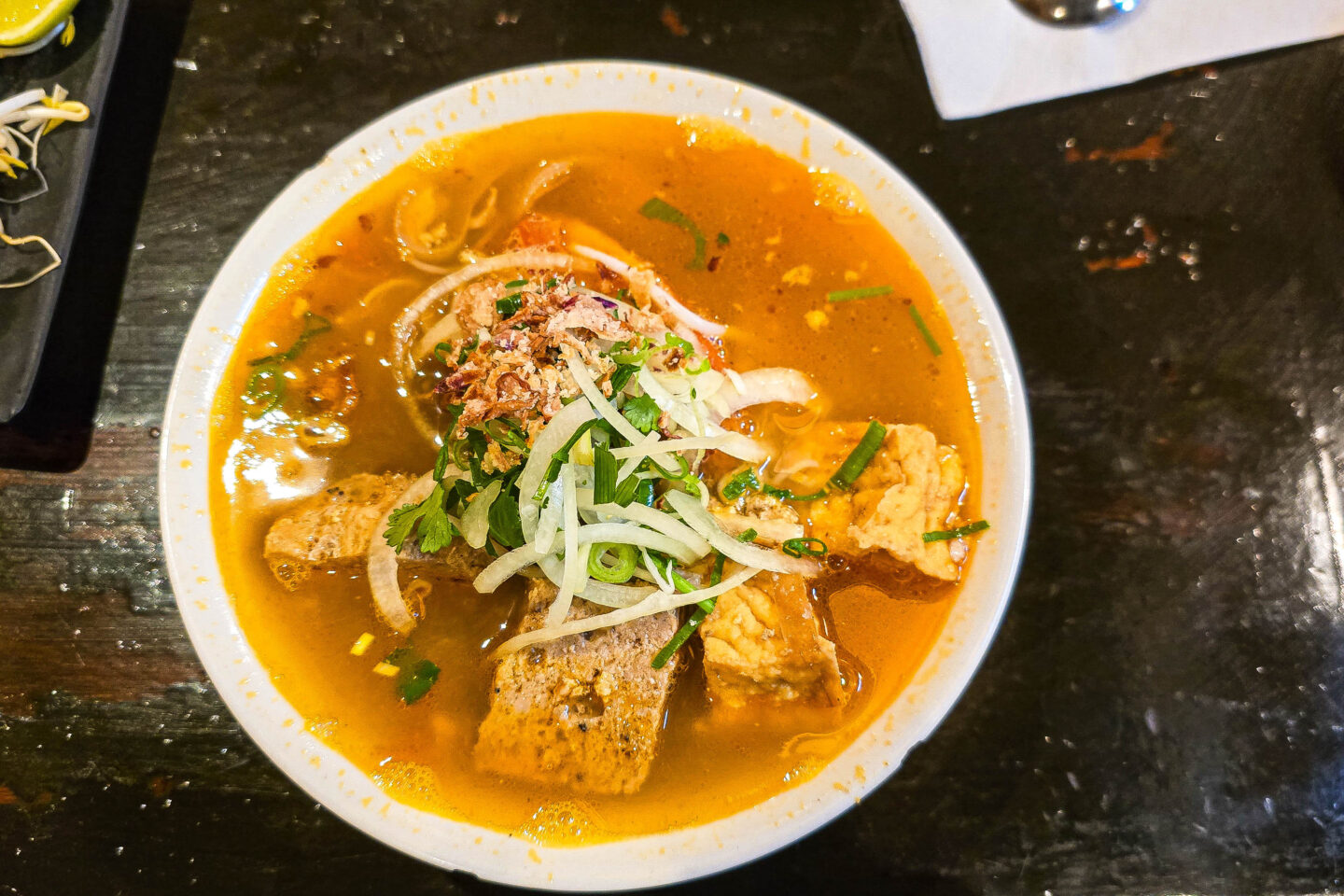 This is the bun rieu for $17. It was a hearty bowl, full of umami flavouring and all the right ingredients: tofu, shredded crab, fish cake, pork loaf, tomatoes, noodles, toppings.