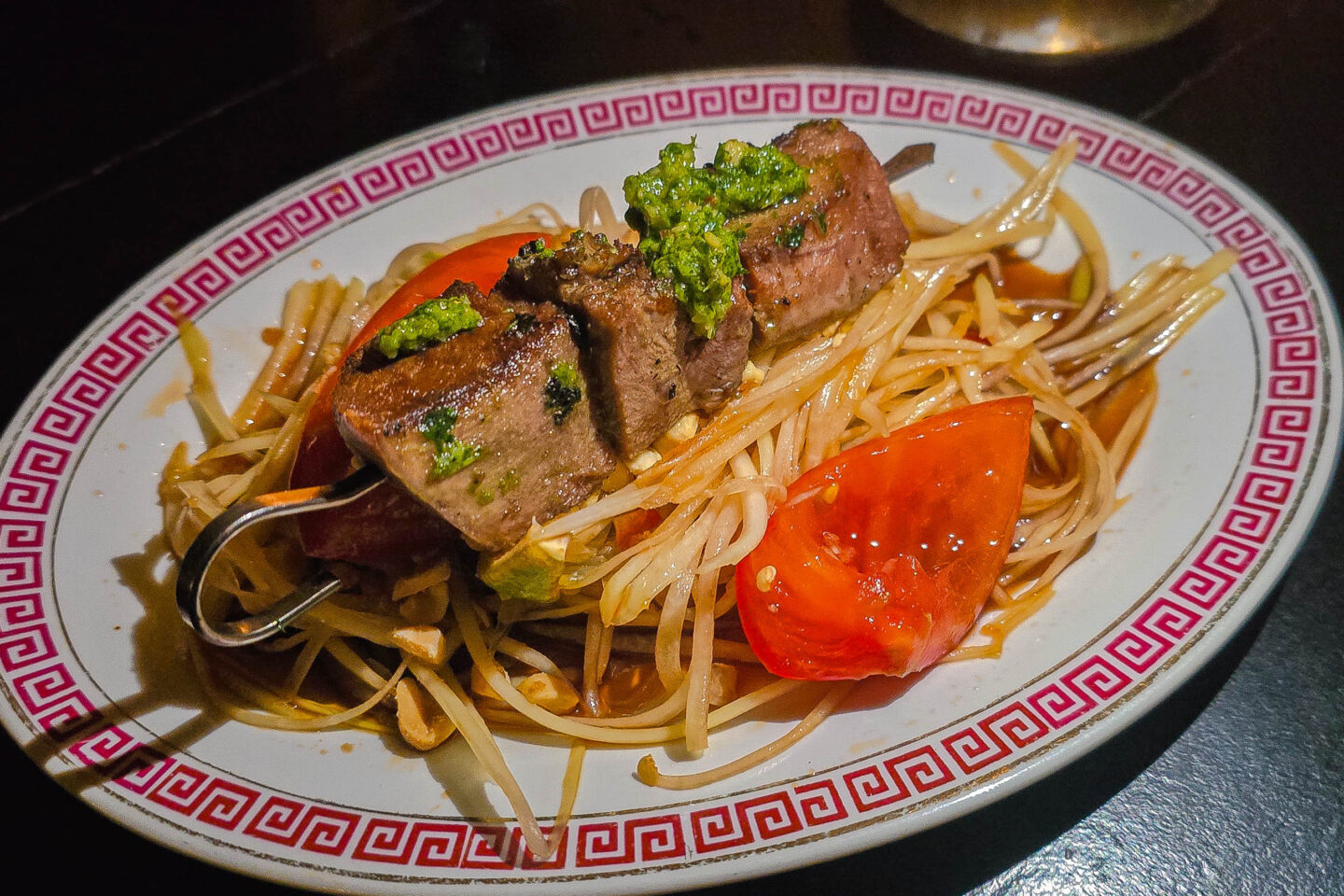 The ox tongue skewer was tender and smokey, paired with a crisp green papaya and tomatoes salad, with crushed peanuts for $22.