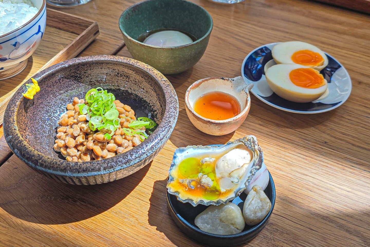 This was an array of sides we got, including a nama kaki for $6. It was oyster with ponzu and spring onion oil. It tasted refreshing and unique. The natto was enjoyable.