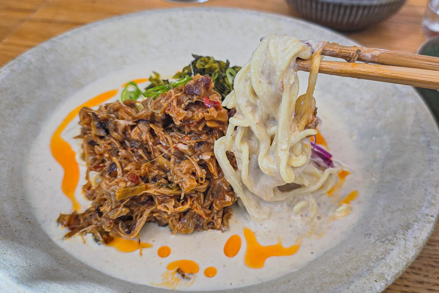 This was their seasonal hiyashi tan-tan men for $28. It was cold ramen noodles with miso mushroom, takana, sesame sauce and six-eyed scorpion chilli oil. It was interesting. I’ve never had cold ramen so my tastebuds were going off, but it was overall delicious. The broth was milky, the mouthfeel was a soft chew and the flavours were a mix of chilli and cream.