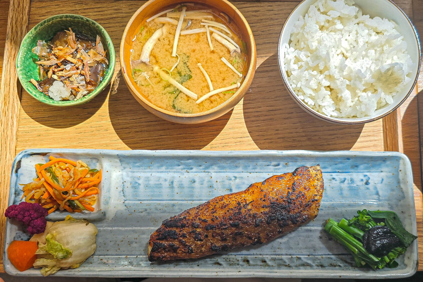 This was the Japanese breakfast teishoku 朝ごはん定食 for $34. It had grilled market fish, rice, miso soup, pickles & daily okazu. We got an extra onsen egg for $3.50. Everything was delicious and cooked to perfection. It tasted homey. The fish was charred and smelled amazing.