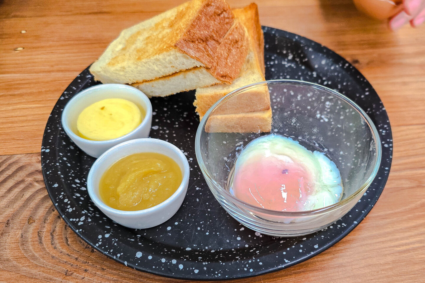 This was their morning kaya set for $13.50. It is exactly like the previous dish, but with homemade kaya and an onsen egg. The kaya was sweet and reminiscent of our childhood, so a wonderful addition to the dish.