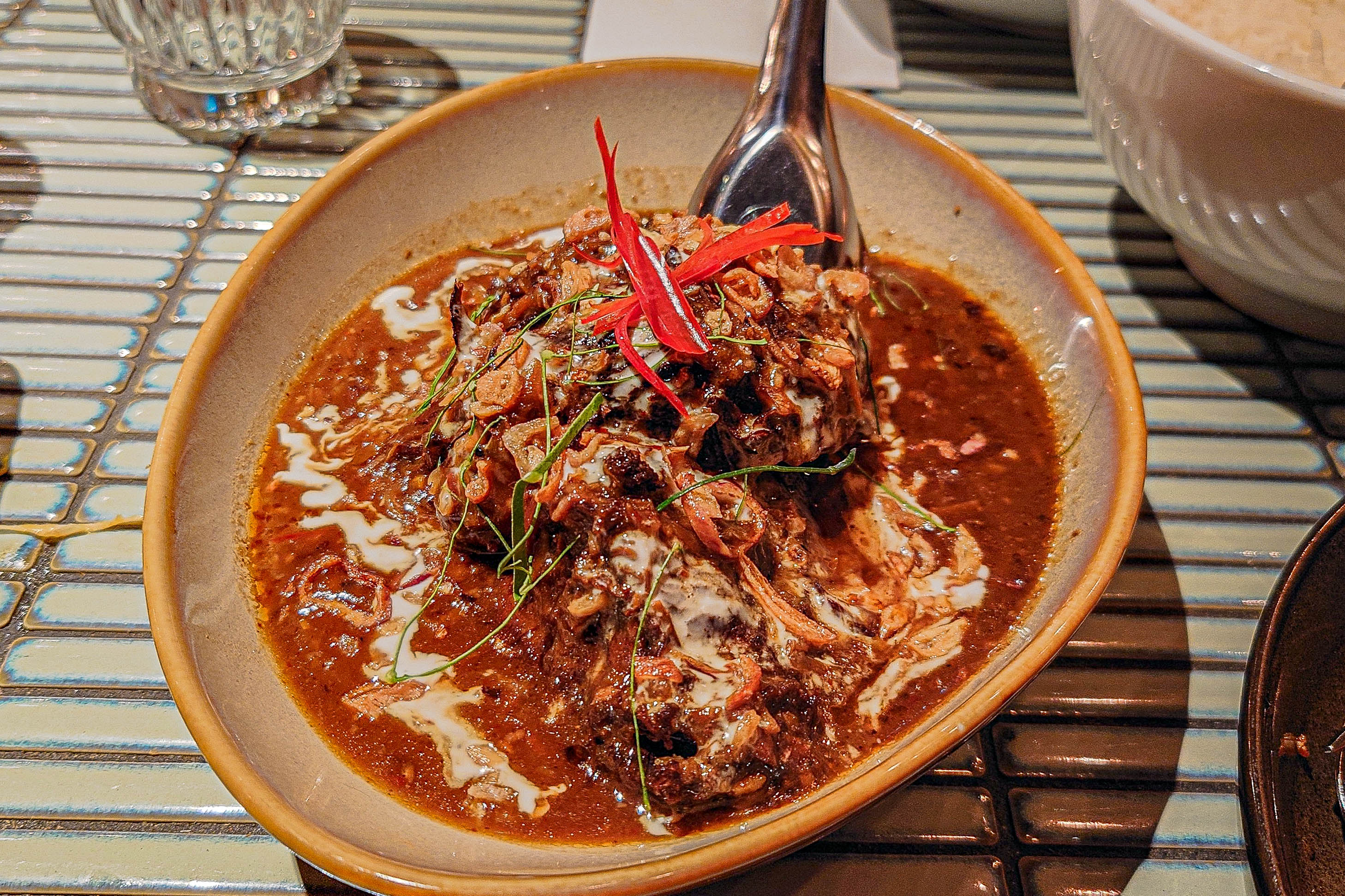 Okay this tom yum hot pot SLAPS 🔥. This was a spicy tomyum soup with tiger prawns and squid for $26. It was a very generous portion for 2 people. This tom yum was the most aromatic and perfect balance of sourness, hotness and saltiness. So good and soothing to the soul. The proteins were juicy and flavourful, soaking up all the soup. The only downside was the seafood was not the freshest. We ate this with vermicelli noodles.