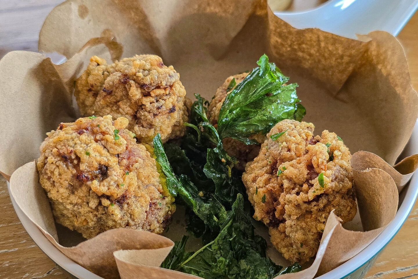 The Papa Lee’s chicken bites were 55,000 rupiah (~$5). They had a thin crispy batter, and the juiciest meat. It was seasoned with msg, chicken powder and sugar. The fried kale was a nice textural touch.