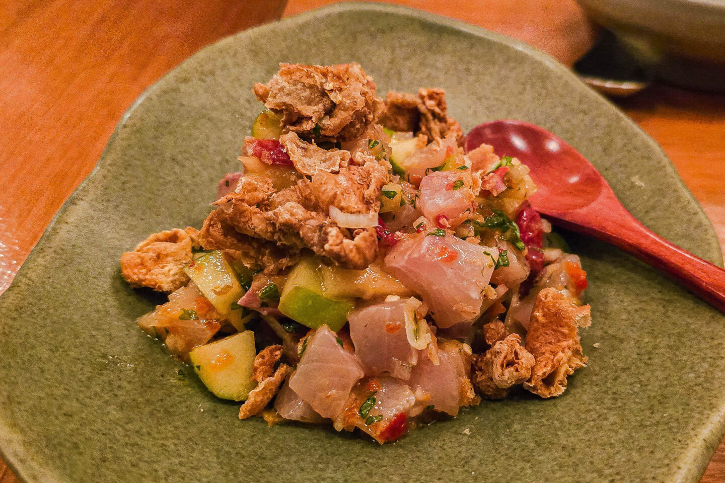 Our first dish was kinilaw for $30. Traditionally this is raw fish cooked with acidic ingredients and fresh vegetables. For this, we had wild kingfish, smoked green apple and chicken chicharron. This was a good balance of textures, where the tender fish was complemented well by the smokey sweetness of the green apple and savoury crunchiness of the chicharron.