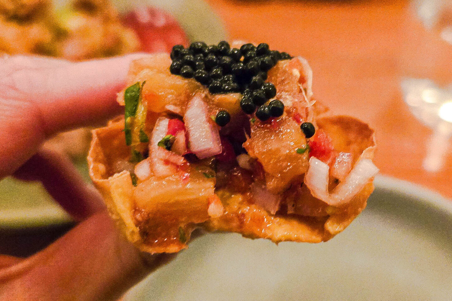 Next was selat lumpia, for $12 each. This is a popular snack that is essentially a spring roll. At Serai, they mixed it up by using the spring roll as a tart base, filling it with smoked pineapple, spiced coconut and caviar. This was delicious and one of the best dishes of the night.