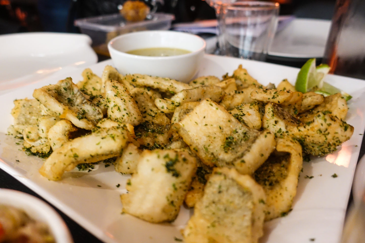 There was a funny moment while cooking this when one of the other members of our cooking group decided to show off her “culinary skills” by dipping her wet spoon into the oil to get some of the squid pieces out.