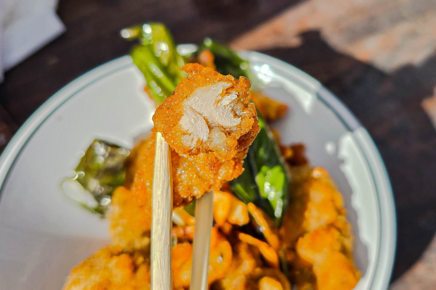 The crispy popcorn chicken for $12.95 was perfect! It was a savoury bite, of thin seasoned batter with the juiciest filling. The fried leafs added a nice airy texture to the bite too.