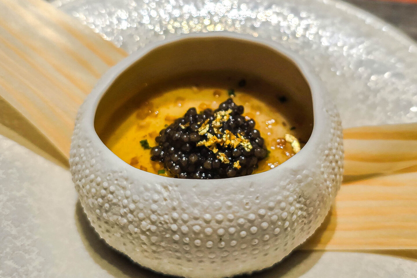 The use of duck egg gave the bite a rich and fatty flavourbomb that we had never seen done before, and the fact that it was cooked in brown butter made it all the more delectable. Our eyes were rolling backwards wtih each bite. The caviar cut through with its infamous pops of oceanic saltiness, and the gold flakes made it visually mouthwatering and luscious.