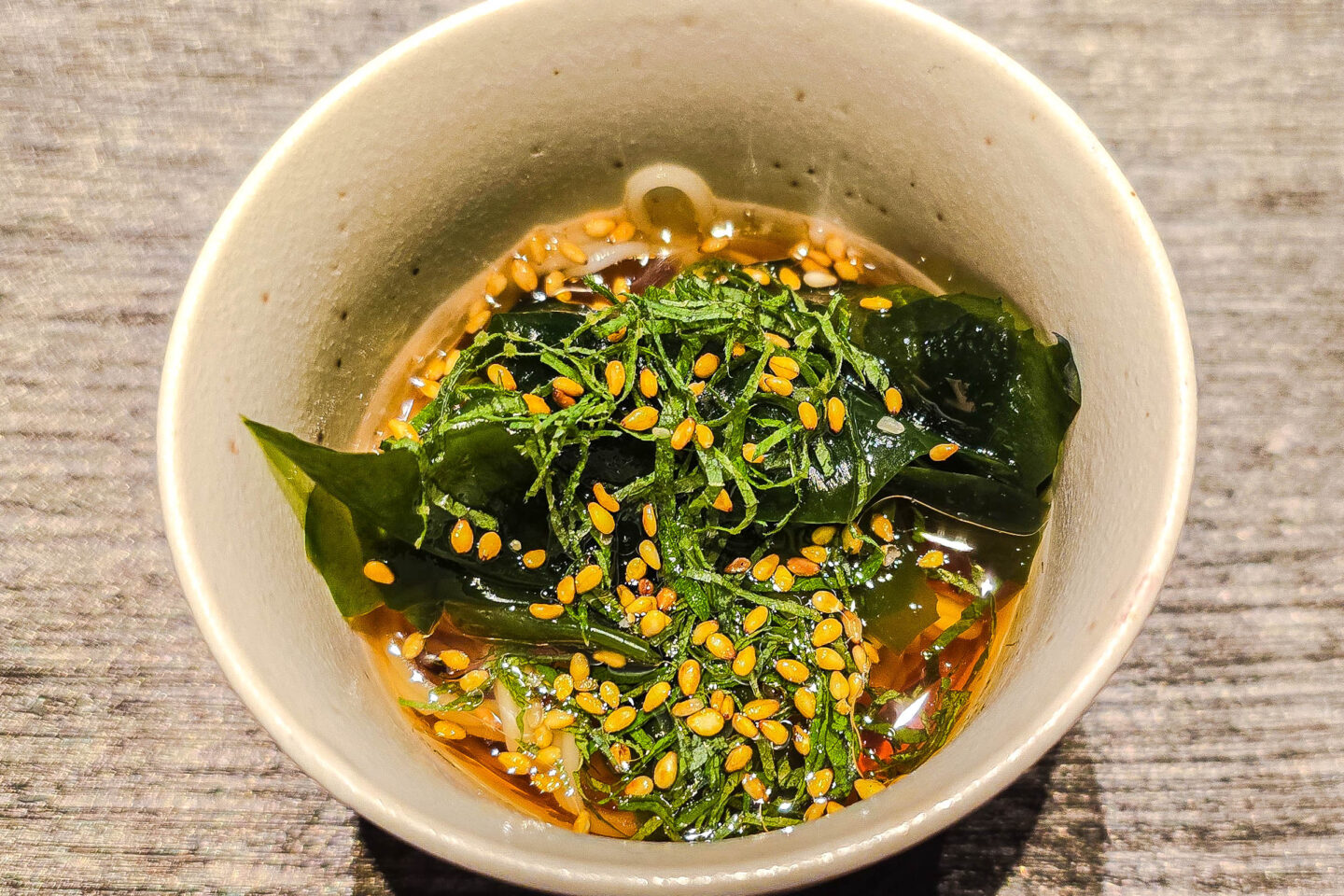 This was a dashi and wakami noodle soup. It was sweet and cold, with a lot of umami flavours from the wakame (edible seaweed), bonito flakes and kombu. It also had green shisho from NSW, giving it a subtle earthy note too.
